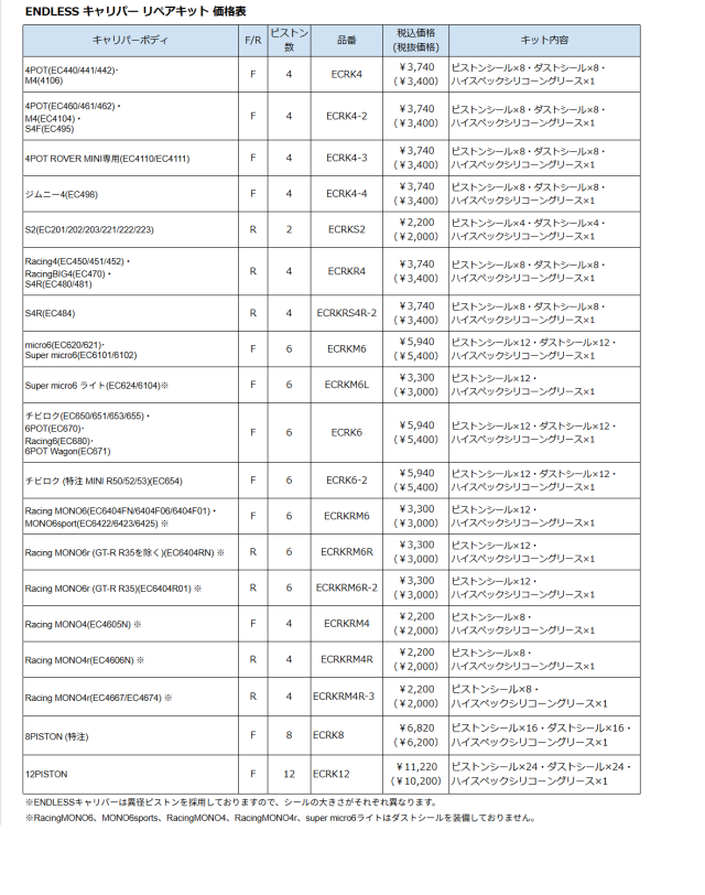 ENDLESSキャリパー専用のリペアキットです。